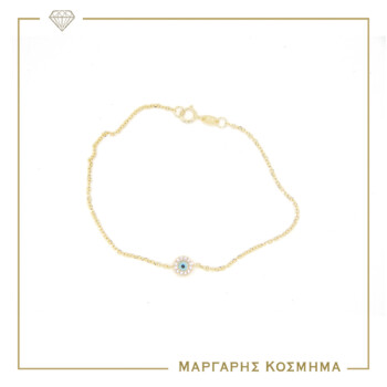 Λαμπερό γυναικείο βραχιόλι σε κίτρινο χρυσό Κ14, με ροζέτα και ματάκι.