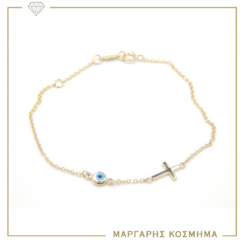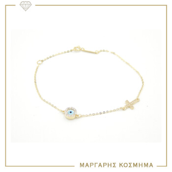 Λαμπερό γυναικείο βραχιόλι σε κίτρινο χρυσό Κ14, με ματάκι και σταυρό στολισμένα με ζιργκόν.