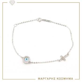 Λαμπερό γυναικείο βραχιόλι σε λευκό χρυσό Κ14, με ματάκι και σταυρό στολισμένα με ζιργκόν.