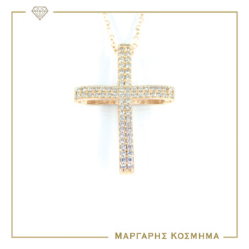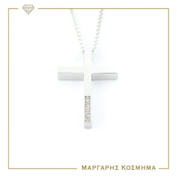 Εντυπωσιακός σταυρός αρραβώνα ή βάπτισης με αλυσίδα απο χρυσό 14 καρατίων σε λουστρέ φινίρισμα, διακοσμημένος στην κάθετη επιφάνεια του με λευκές πέτρες ζιργκόν!