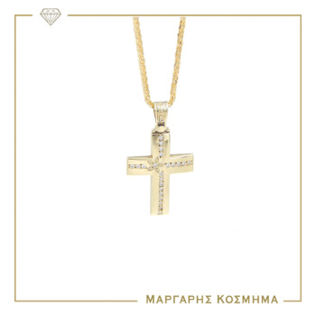 Εντυπωσιακός σταυρός αρραβώνα ή βάπτισης με αλυσίδα απο χρυσό 14 καρατίων σε λουστρέ φινίρισμα, διακοσμημένος στην κάθετη επιφάνεια του με λευκές πέτρες ζιργκόν!