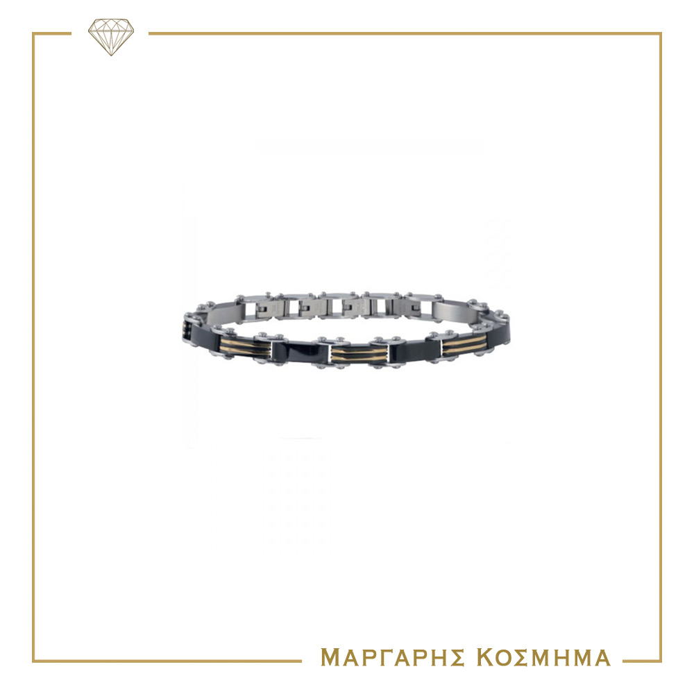 Ενα πανέμορφο μοντέρνο ανδρικό βραχιόλι από ανοξείδωτο ατσάλι με μαύρες και χρυσές λεπτομέρειες.