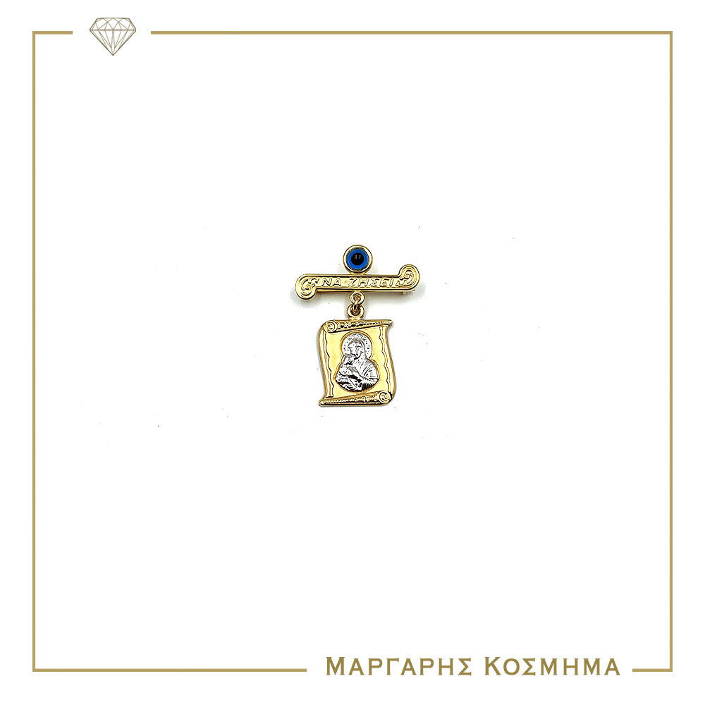 Κρεμαστό φυλαχτό Δίχρωμη Παναγίτσα, από χρυσό, με ανάγλυφες ασημί λεπτομέρειες και ένα μπλε ματάκι