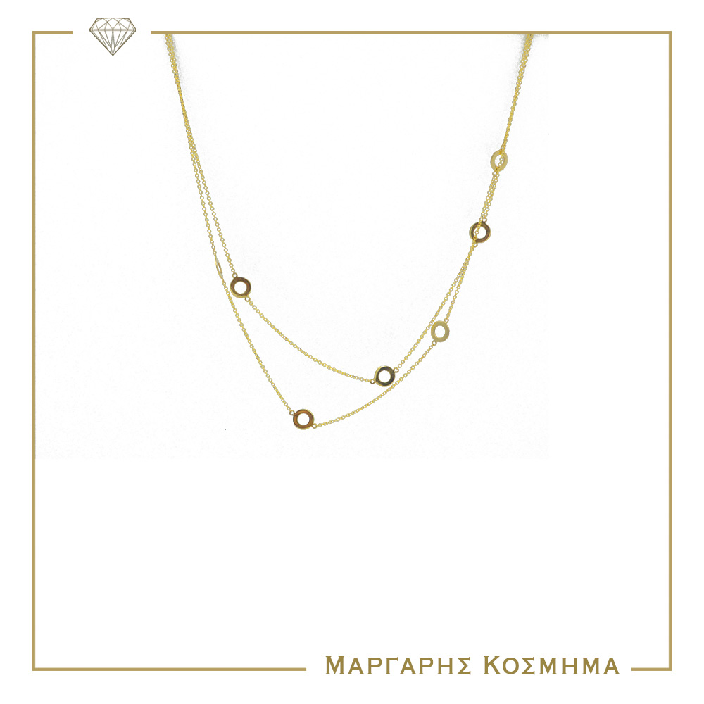 Μοντέρνο δυναικείο κολιέ σε κίτρινο χρυσό 14 καρατίων, με διπλή αλυσίδα διακοσμημένη με μικρούς κύκλους σε λουστρέ φινίρισμα! Δώστε λάμψη στην καθημερινή σας εμφάνιση!