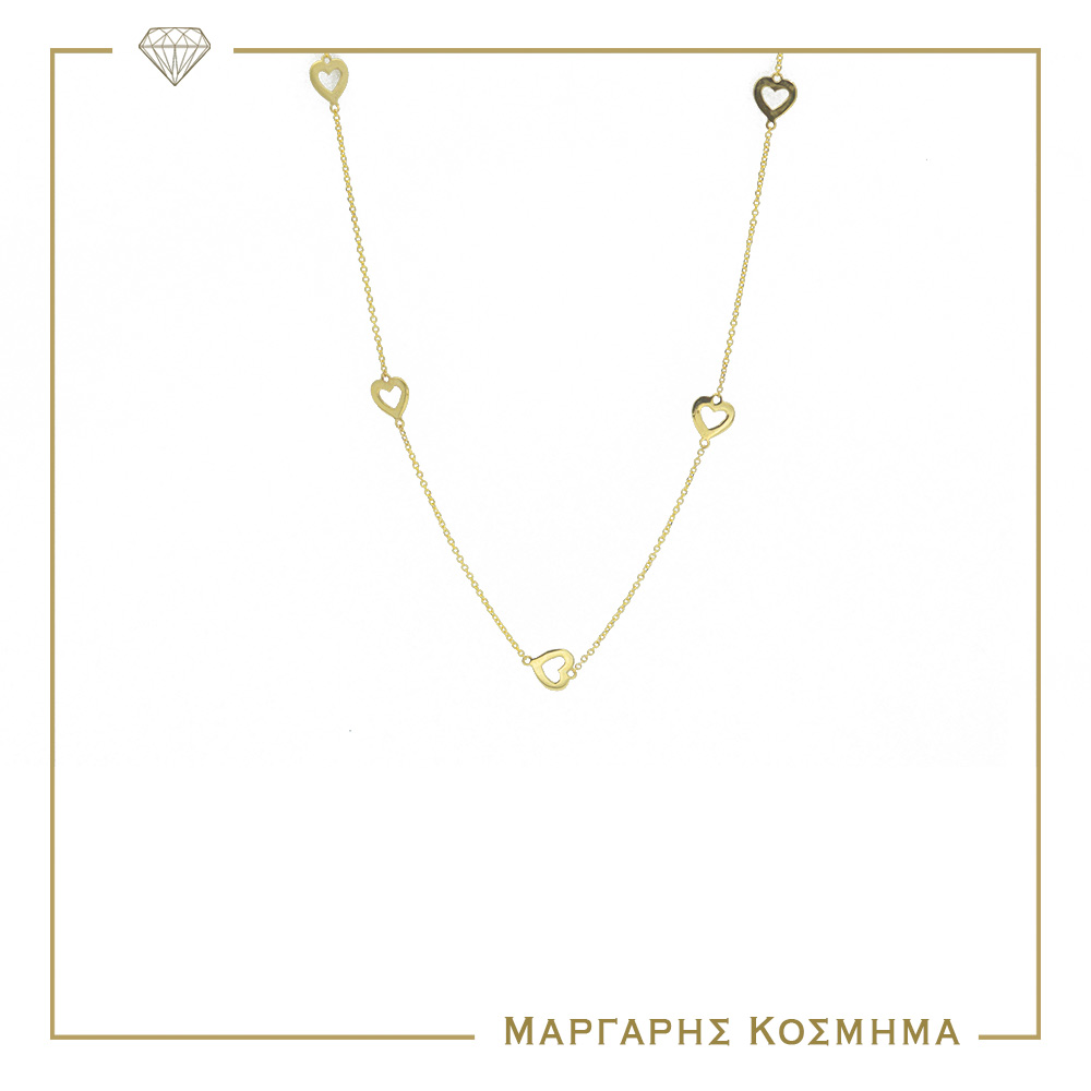 Μοντέρνο γυναικείο κολιέ σε κίτρινο χρυσό Κ14 στολισμένο με καρδιές.