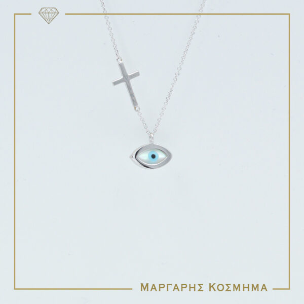 Υπέροχο γυναικείο λευκόχρυσο κολιέ Κ14, με ματάκι και σταυρουδάκι!