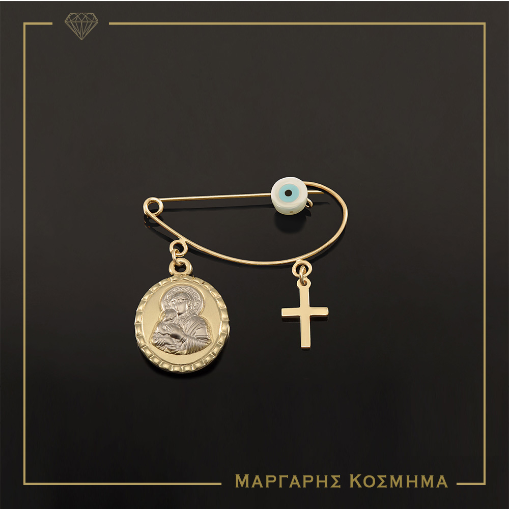 Παιδικό Φυλαχτό από χρυσό διακοσμημένο με την Παναγίτσα , τον Σταυρό και ένα μπλε ματάκι.