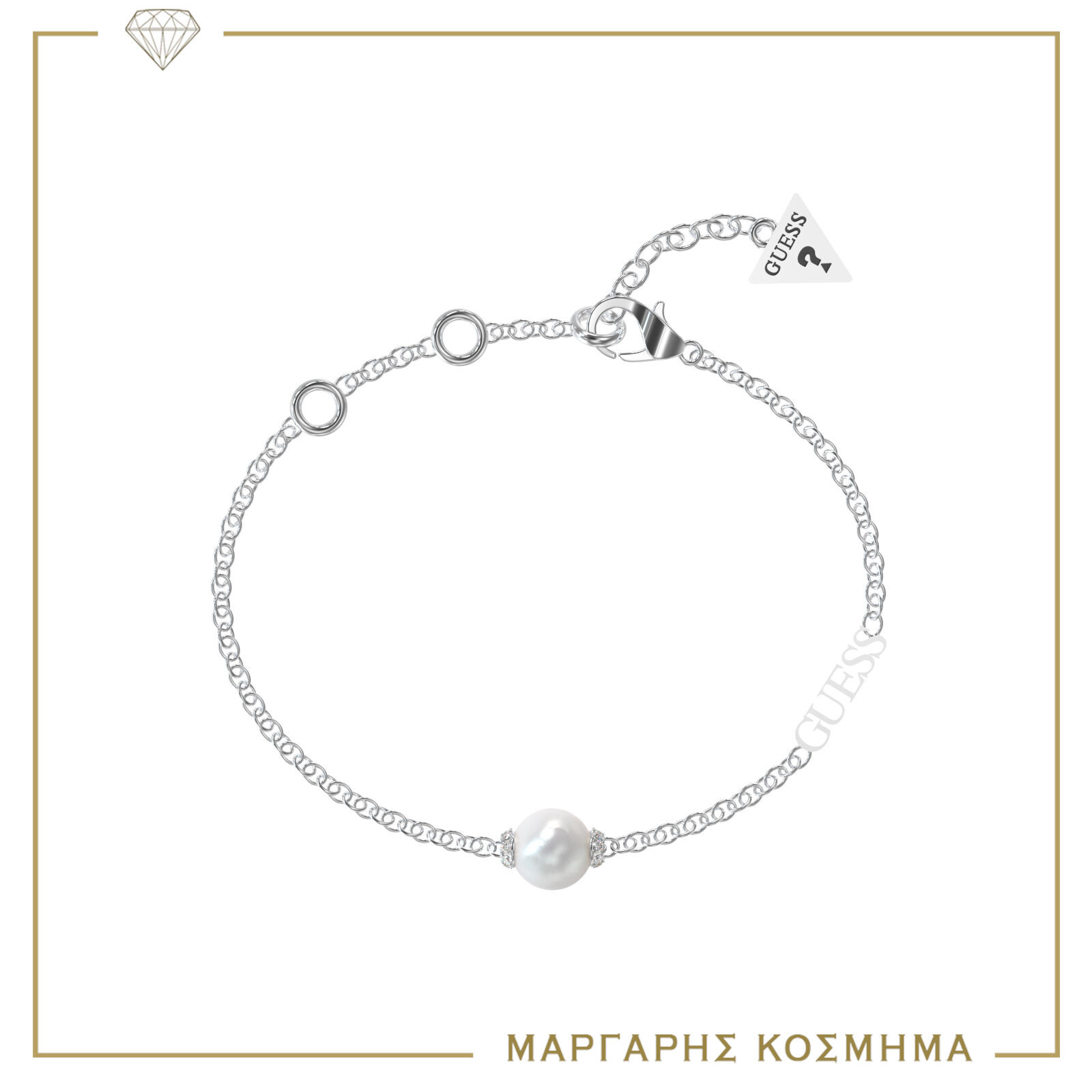 Γυναικείο βραχιόλι GUESS STEEL ασημένιου χρώματος με κρεμαστό μαργαριτάρι με ζιργκον (Fresh Water Perl). Και το λογότυπο της εταιρείας