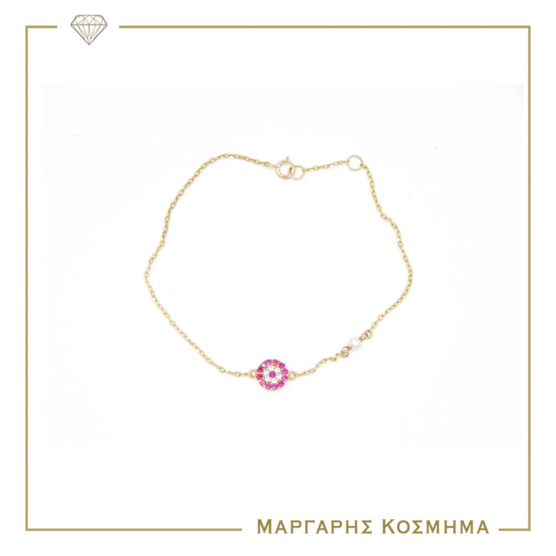 Μοντέρνο γυναικείο βραχιόλι σε κίτρινο χρυσό 14 καρατίων, διακοσμημένο με μια στρογγυλή ροζέτα στο κέντρο του, στολισμένη με λευκές και φούξια πέτρες ζιργκόν και ένα μαργαριταράκι στο πλάι της αλυσίδας! Ένα διακριτικό κόσμημα για το χέρι σας που δεν θα αποχωρίζεστε!