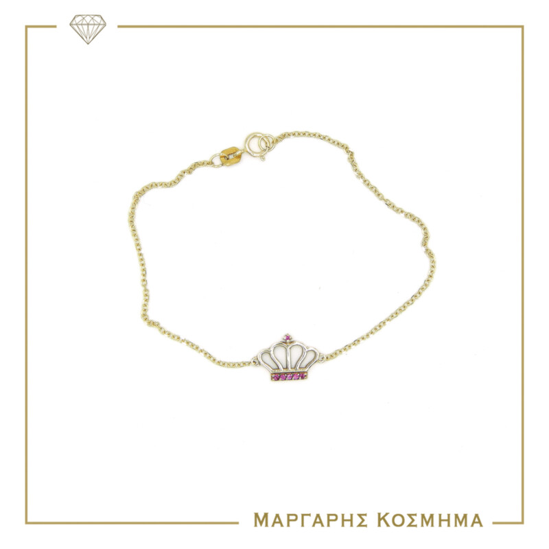 Μοντέρνο γυναικείο βραχιόλι σε κίτρινο χρυσό 14 καρατίων, με μία πολύ όμορφη κρεμαστή κορώνα σε λουστρέ φινίρισμα στολισμένη με φούξια πέτρες ζιργκόν! Για στυλάτες και χαριτωμένες εμφανίσεις κάθε μέρα!