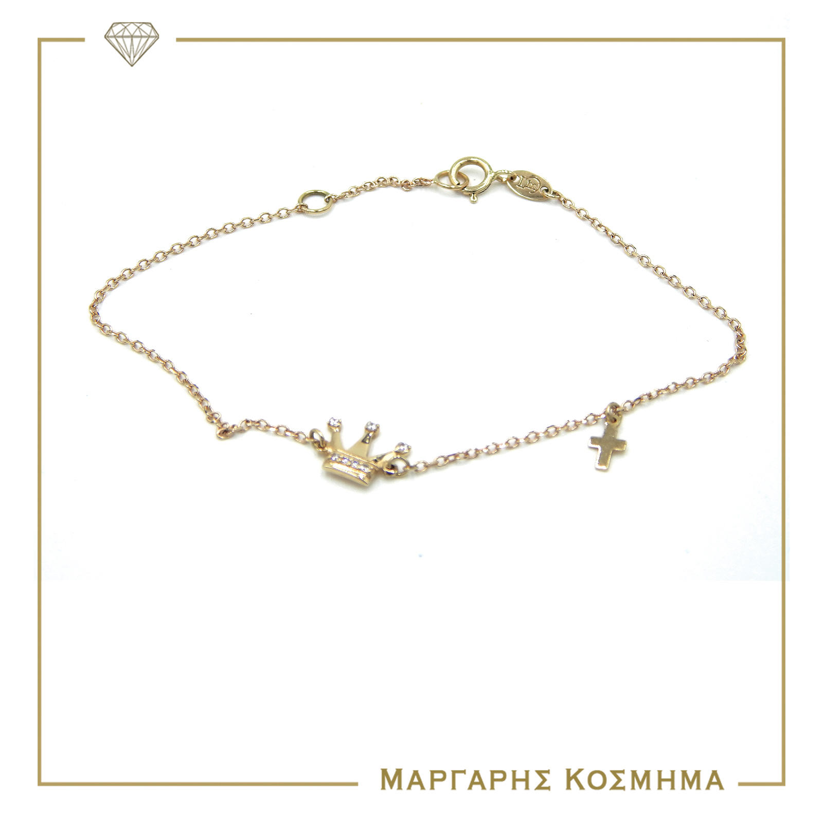 Κομψό γυναικείο βραχιόλι σε κίτρινο χρυσό Κ14 , με κορώνα & σταυρό!