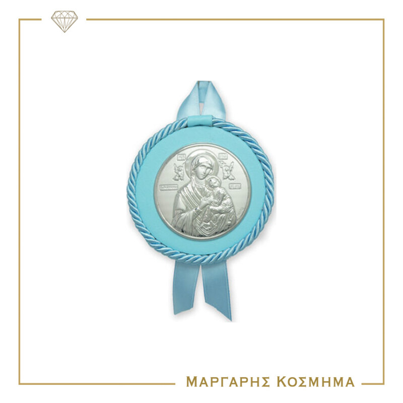 Κρεμαστό Φυλαχτό σιέλ για κούνια με την εικόνα της Παναγίας.