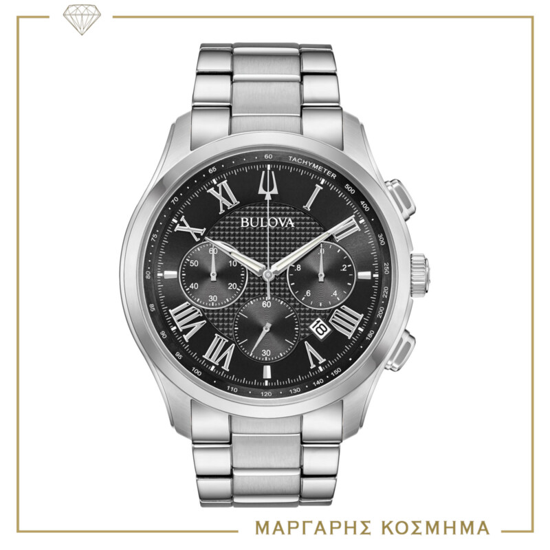 Ένα ρολόι της Bulova από τη σειρά Sport με κάσα από ανοξείδωτο ατσάλι 44mm και ατσάλινο μπρασελέ. Το καντράν έχει έντονα στοιχεία και φωσφορίζοντες δείκτες.
