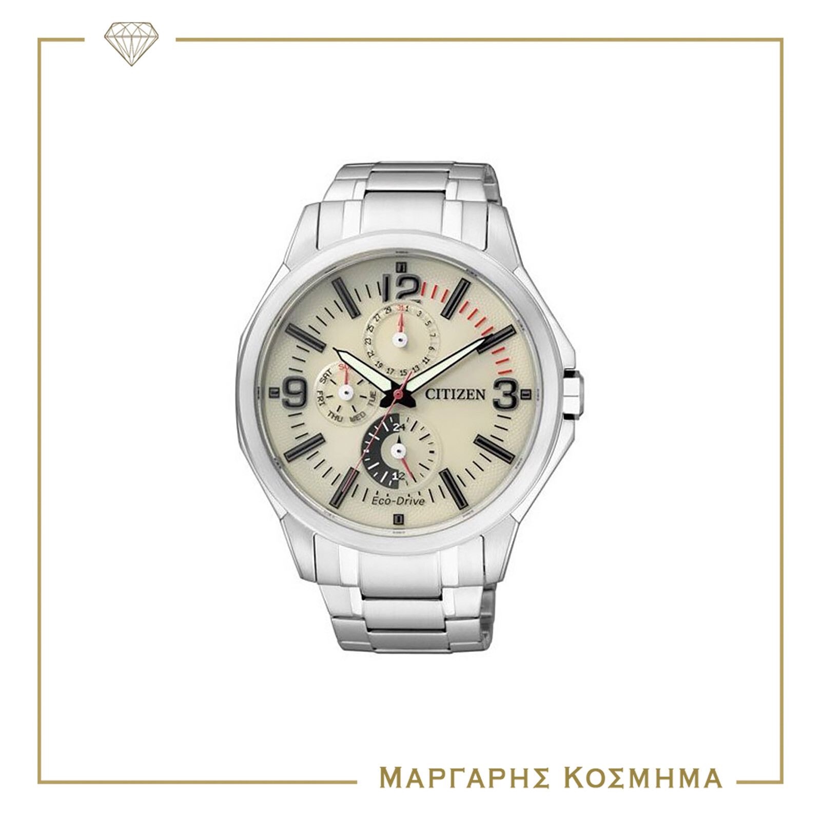 Ένα ρολόι της Citizen Eco-Drive με κάσα και μπρασελέ από ανοξείδωτο ατσάλι. Το καντράν είναι σε εκρού χρώμα με ανάγλυφα στοιχεία σε μαύρο χρώμα.