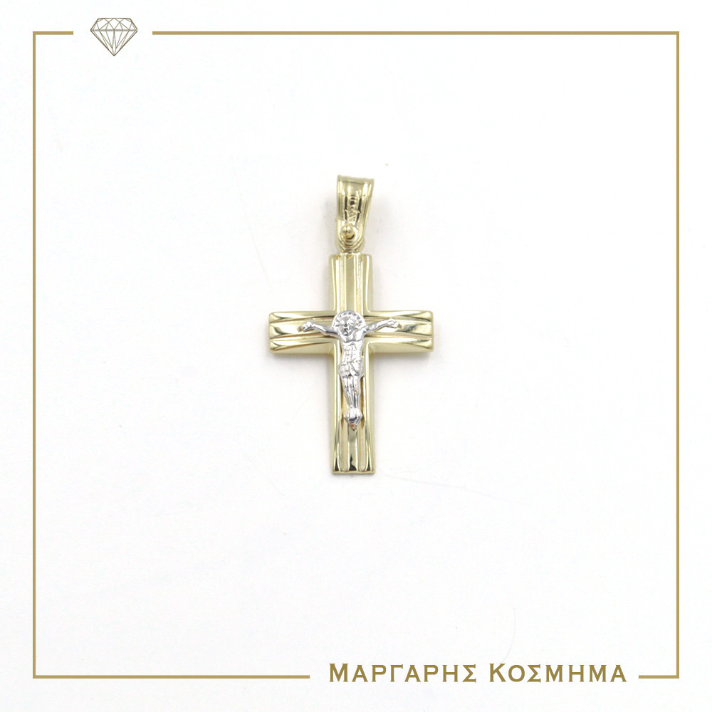 Εντυπωσιακός σταυρός αρραβώνα ή βάπτισης απο χρυσό 14 καρατίων που συνδυάζει το λουστρέ με το ματ φινίρισμα, με χρυσό περίγραμμα και με ανάγλυφες κάθετες και οριζόντιες λευκόχρυσες αυλακώσεις!