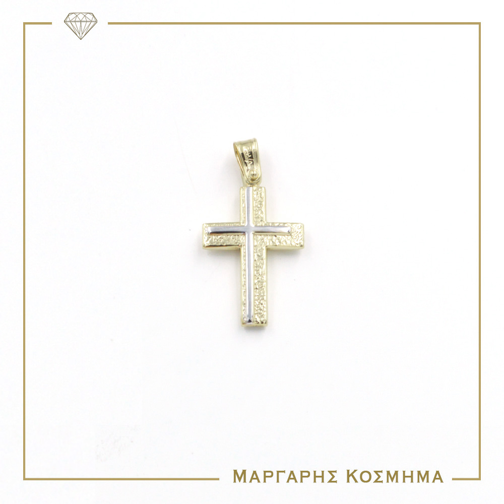 Ιδιαίτερος σταυρός αρραβώνα ή βάπτισης χρυσός 14 καρατίων που συνδυάζει το λουστρέ με το ματ φινίρισμα, τον οποίο στολίζει ένας μικρότερος σταυρός σε λευκόχρυσο, σε ανάγλυφο σχέδιο!