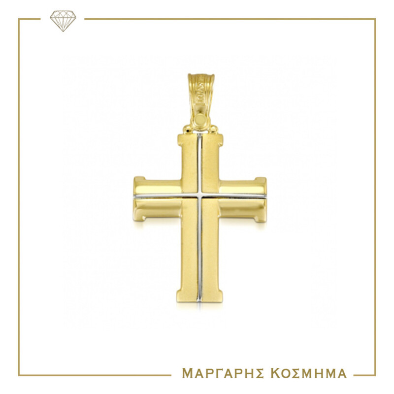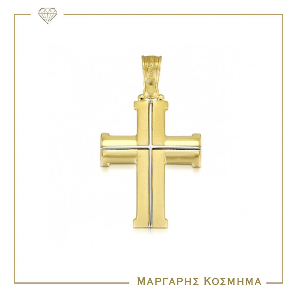 Μοντέρνος σταυρός αρραβώνα ή βάπτισης από χρυσό 14 καρατίων σε λουστρέ και ματ φινίρισμα, με ιδιαίτερες λεπτομέρειες στις άκρες του και ανάγλυφο λευκόχρυσο σταυρό στο κέντρο του! Ένας υπέροχος σταυρός ειδικός για κάθε περίσταση που θέλετε! Συνδυάστε το με την αλυσίδα της αρεσκείας σας από τη συλλογή μας για τέλειο αποτέλεσμα!