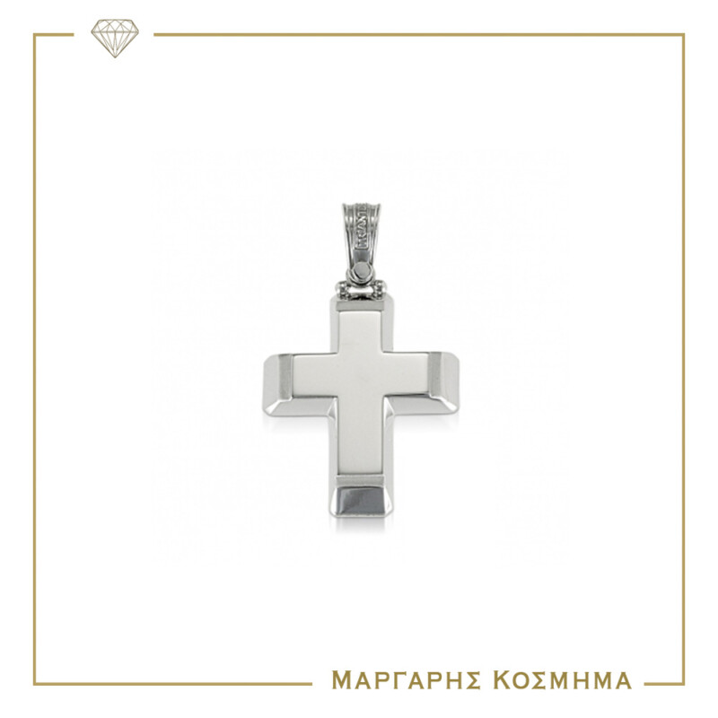 Κλασικός σταυρός αρραβώνα ή βάπτισης λευκόχρυσος 14 καρατίων που συνδυάζει το λουστρέ με το ματ σαγρέ φινίρισμα, σε ιδιαίτερο πομπέ σχεδιασμό και με τις γωνίες του σε πλάγια κοπή