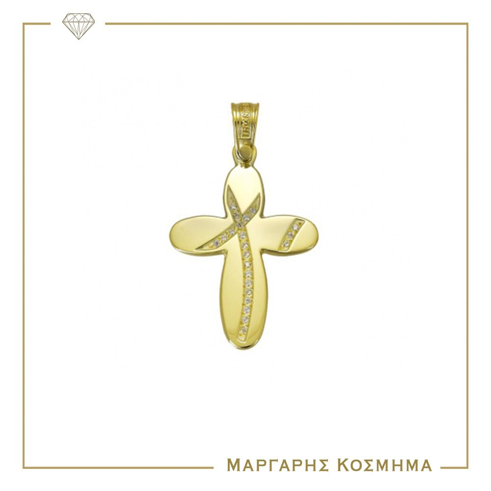 Λαμπερός σταυρός αρραβώνα ή βάπτισης απο χρυσό 14 καρατίων με λουστρέ φινίρισμα, σε μοντέρνες τάσεις και λευκές πέτρες ζιργκόν να το διακοσμούν!