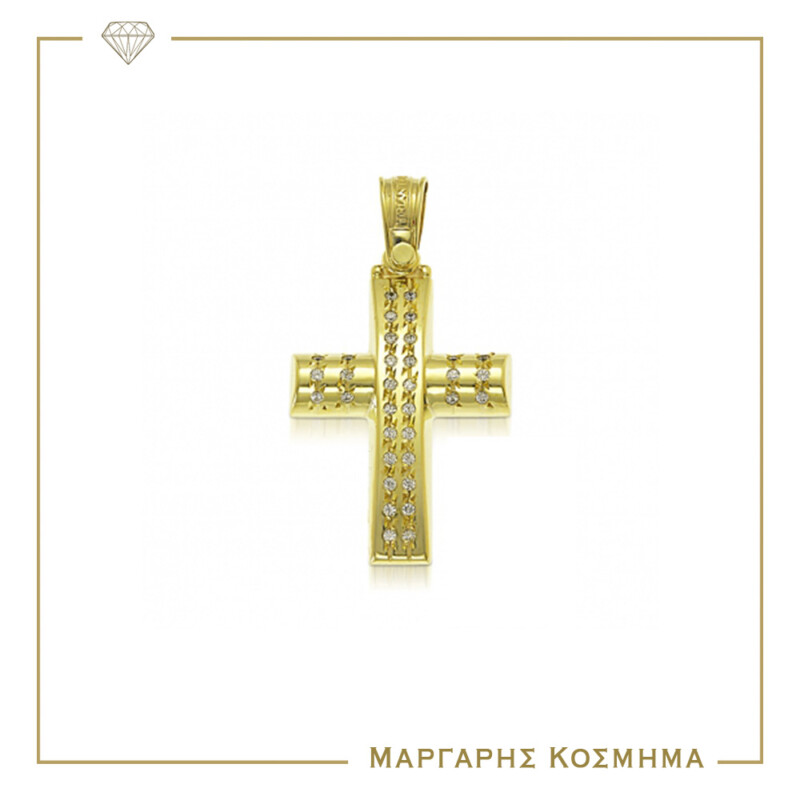 Λαμπερός σταυρός αρραβώνα ή βάπτισης απο χρυσό 14 καρατίων με λουστρέ φινίρισμα, στολισμένος με λευκές πέτρες ζιργκόν και ανάγλυφες λεπτομέρειες!