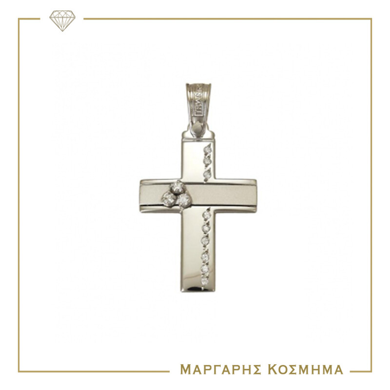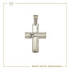 Εντυπωσιακός σταυρός αρραβώνα ή βάπτισης απο λευκόχρυσο 14 καρατίων που συνδυάζει την αμμοβολή με το λουστρέ φινίρισμα, στολισμένος με λευκές πέτρες ζιργκόν!