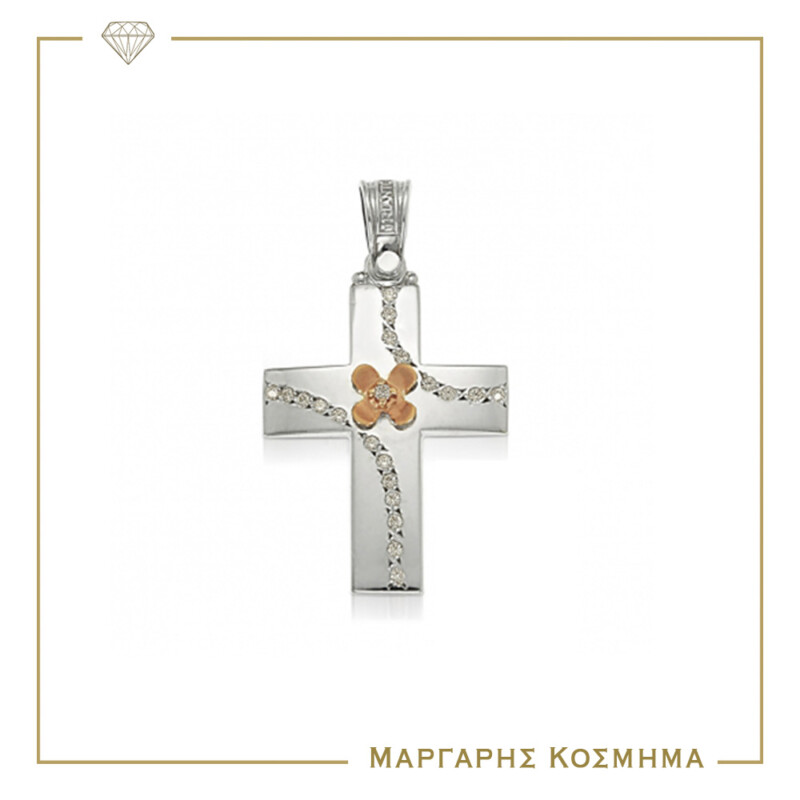 Ιδιαίτερος σταυρός αρραβώνα ή βάπτισης απο λευκόχρυσο 14 καρατίων σε λουστρέ φινίρισμα, διακοσμημένος με λευκές πέτρες ζιργκόν και ένα ανάγλυφο λουλούδι σε ροζ χρυσό στο κέντρο του! Συνδυάστε το με την αλυσίδα της αρεσκείας σας από τη συλλογή μας για τέλειο αποτέλεσμα!