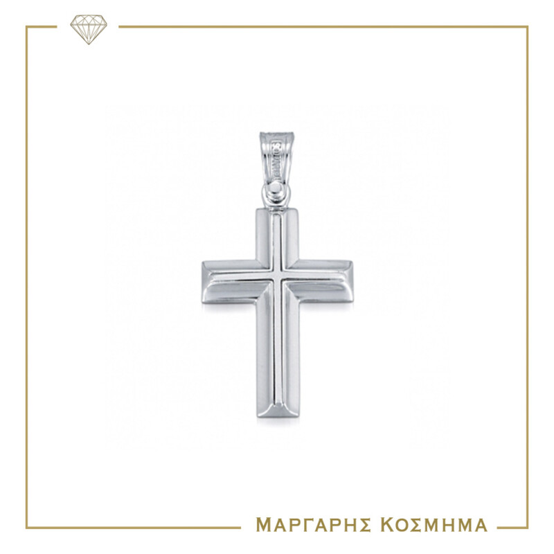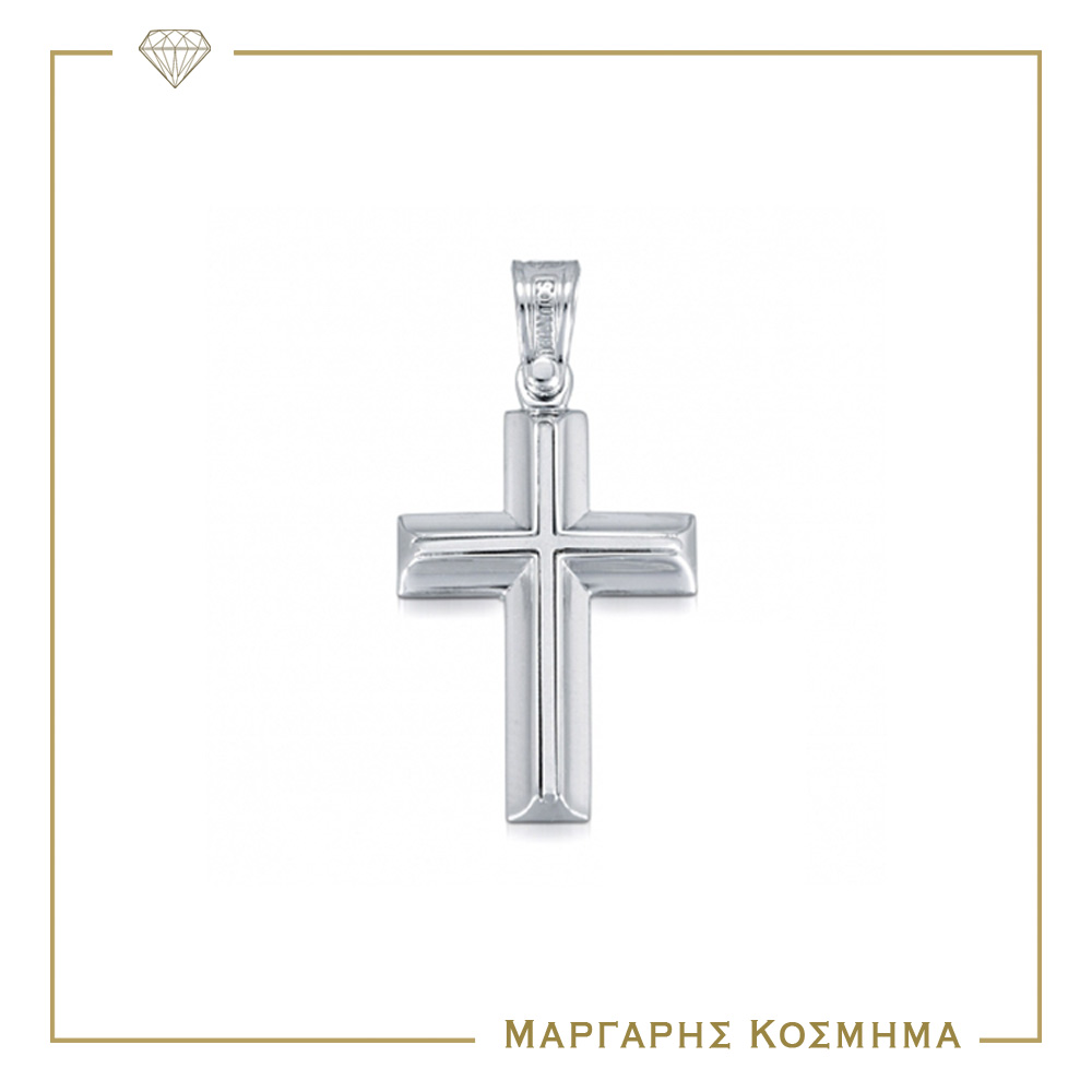Κλασικός σταυρός αρραβώνα ή βάπτισης λευκόχρυσος 14 καρατίων που συνδυάζει το λουστρέ με το ματ σαγρέ φινίρισμα, σε ιδιαίτερο πομπέ σχεδιασμό και με τις γωνίες του σε πλάγια κοπή