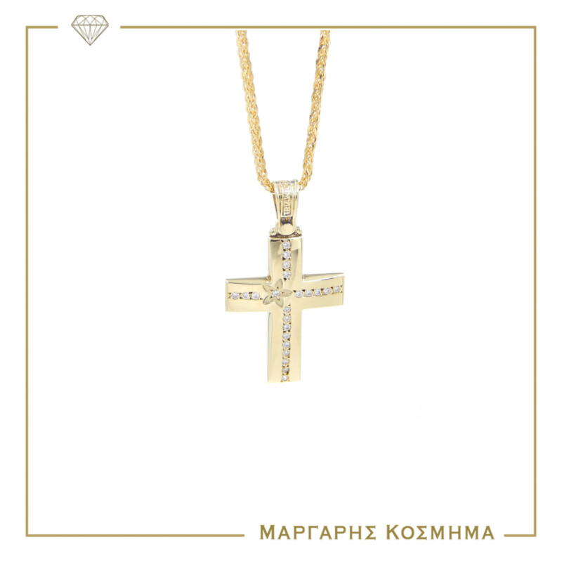 Υπέροχος γυναικείος σταυρός ΤΡΙΑΝΤΟΣ από χρυσό 14 καρατίων. με λουστρέ φινίρισμα, τον οποίο κοσμούν λευκές πέτρες ζιργκόν, σχηματίζοντας μια κάθετη και μια οριζόντια γραμμή. Στολισμένος με σκαλιστό λουλουδάκι, διακοσμημένο με λευκή πέτρα ζιργκόν. Επιλέξτε την αλυσίδα της αρεσκείας σας από τη συλλογή μας και χαρίστε ένα μοναδικό δώρο!