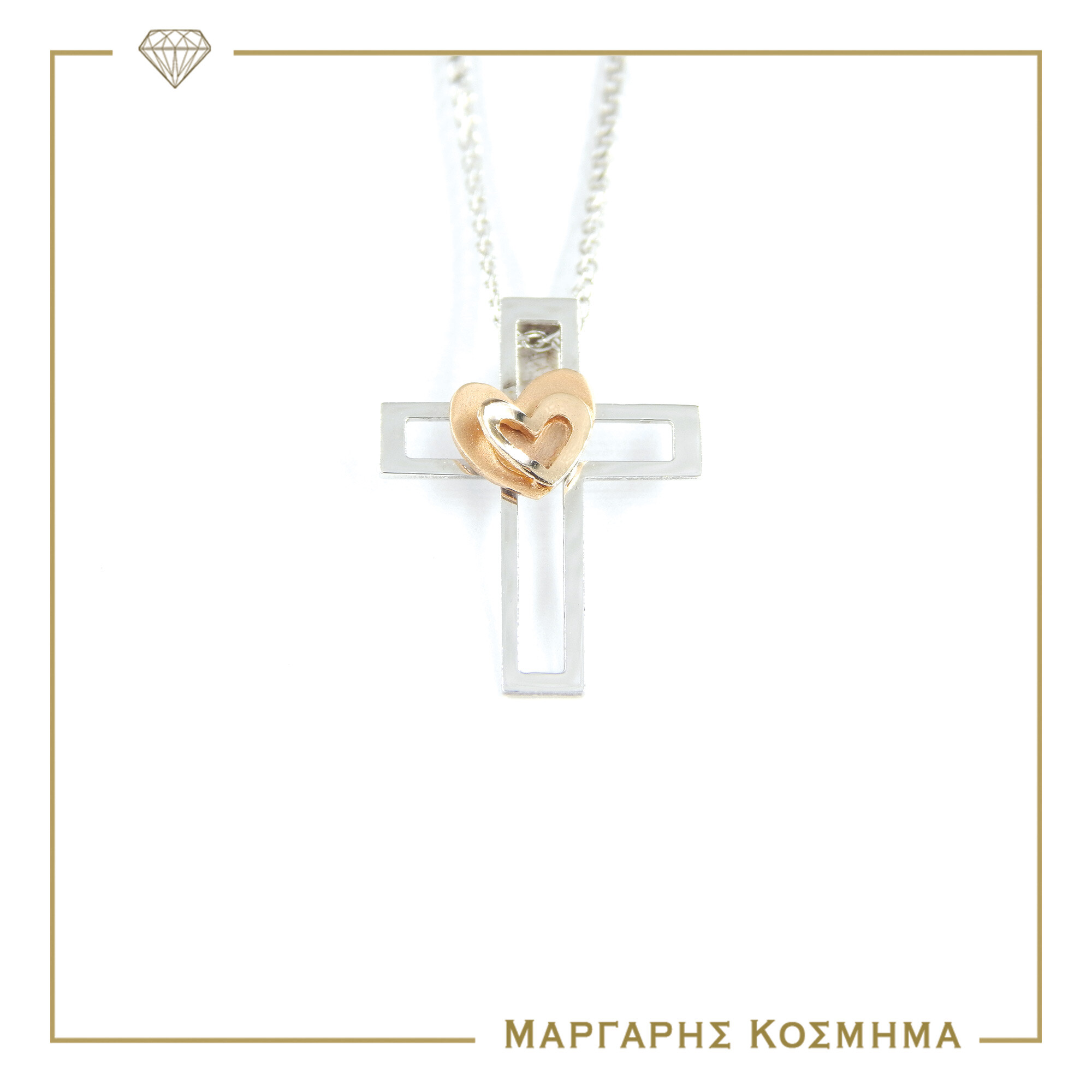 Λευκοχρυσος σταυρος Τριαντος με αλυσιδα στα 14 καρατια,με ενθετο καρδιες σε ροζ χρυσο.