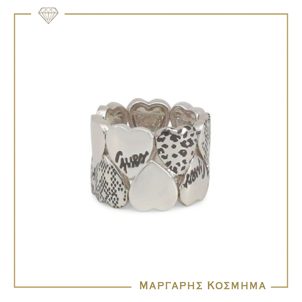Γυναικείο δαχτυλίδι Guess Steel σε ασημί χρώμα, με καρδιές και το λογότυπο της εταιρείας.