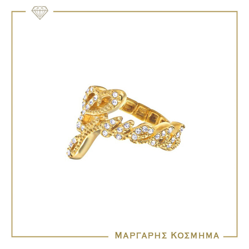 Γυναικείο δαχτυλίδι Guess Steel σε χρυσό χρώμα , με το λογότυπο της εταιρείας στολισμένο με λευκές πέτρες και ελαστική γάμπα στο κάτω μέρος.