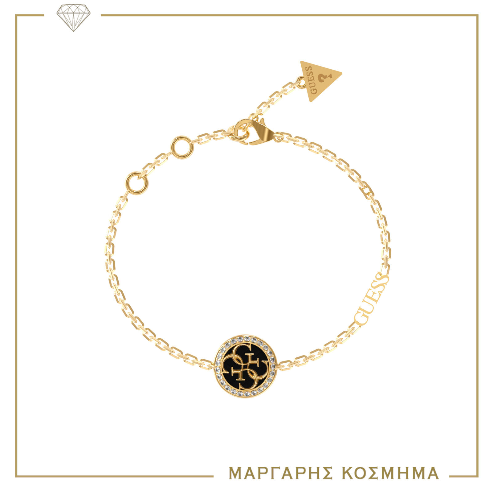 Γυναικείο βραχιόλι GUESS STEEL χρυσού χρώματος με μούρο σχέδιο. Είναι διακοσμημένο με διαφανείς πέτρες ζιργκόν και έχει το λογότυπο της εταιρείας(18,41cm).
