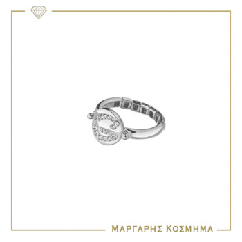 Γυναικείο δαχτυλίδι Guess Steel σε ασημί χρώμα , με λευκές πέτρες στο γράμμα (G) και ελαστική γάμπα στο κάτω μέρος.