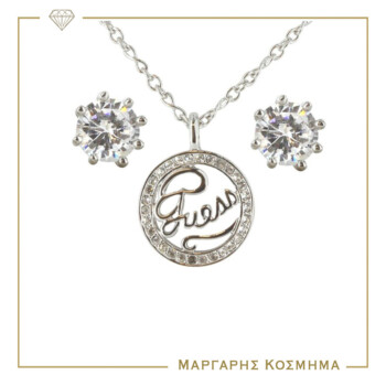 Γυναικείο κολιέ & σκουλαρίκια Guess Steel σε ασημί χρώμα διακοσμημένα από πέτρες ζιργκόν και κρεμαστό το λογότυπο της εταιρείας. 46cm καδένα ρυθμιζόμενη.