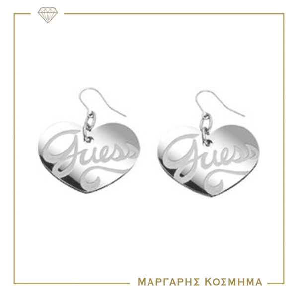 Γυναικείο σκουλαρίκια Guess Steel σε ασημί χρώμα , με καρδιά διακοσμημένη διακοσμημένη με το λογότυπο της εταιρείας.