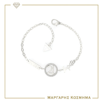 Γυναικείο βραχιόλι GUESS STEEL ασημένιου χρώματος με κρεμαστό με σχέδιο. Είναι διακοσμημένο με διαφανείς πέτρες ζιργκόν και έχει το λογότυπο της εταιρείας(18,41cm).