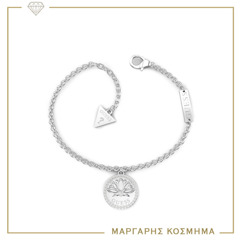 Γυναικείο βραχιόλι GUESS STEEL ασημένιου χρώματος με κρεμαστό με σχέδιο. Είναι διακοσμημένο με διαφανείς πέτρες ζιργκόν και έχει το λογότυπο της εταιρείας(18,41cm).