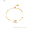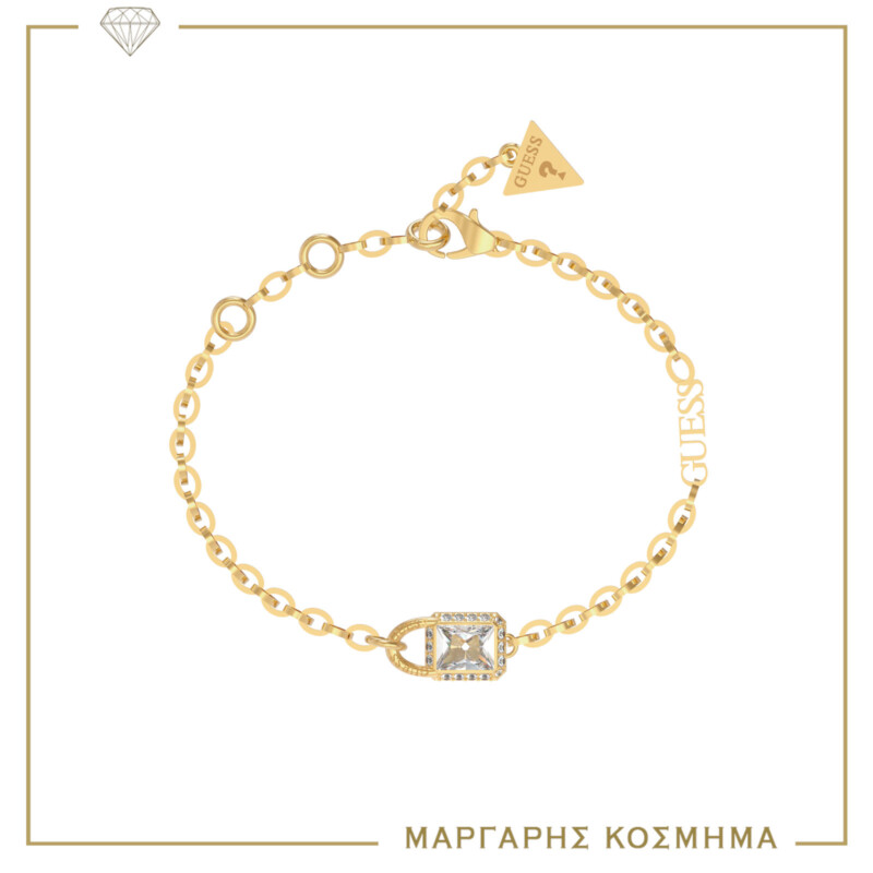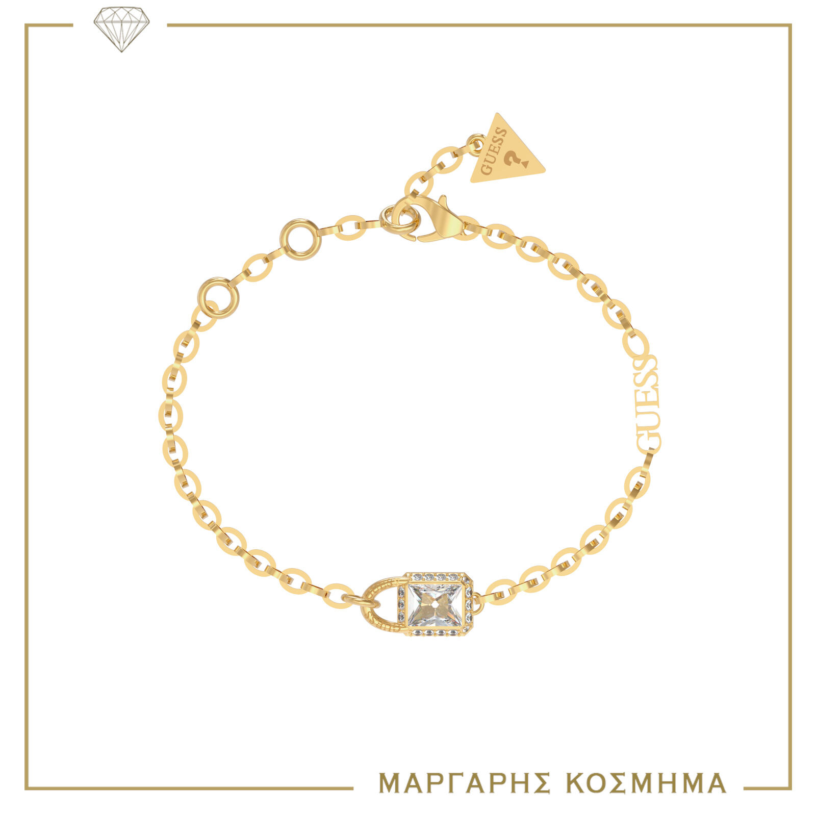 Γυναικείο βραχιόλι GUESS STEEL χρυσού χρώματος με κρεμαστό με σχέδιο. Είναι διακοσμημένο με διαφανείς πέτρες ζιργκόν και έχει το λογότυπο της εταιρείας(18,41cm).
