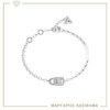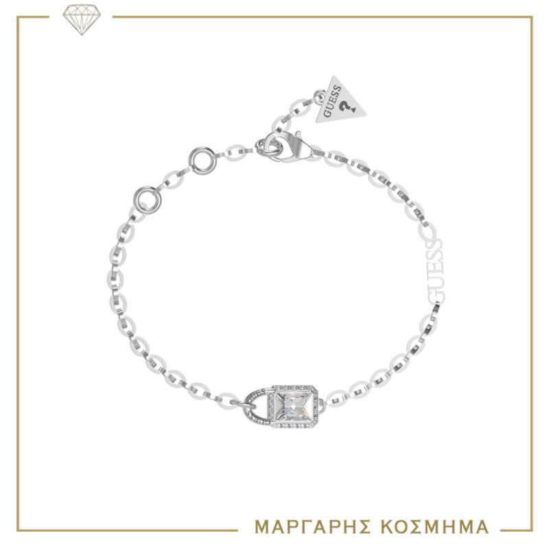 Γυναικείο βραχιόλι GUESS STEEL ασημένιου χρώματος με κρεμαστό με σχέδιο. Είναι διακοσμημένο με διαφανείς πέτρες ζιργκόν και έχει το λογότυπο της εταιρείας(18,41cm).
