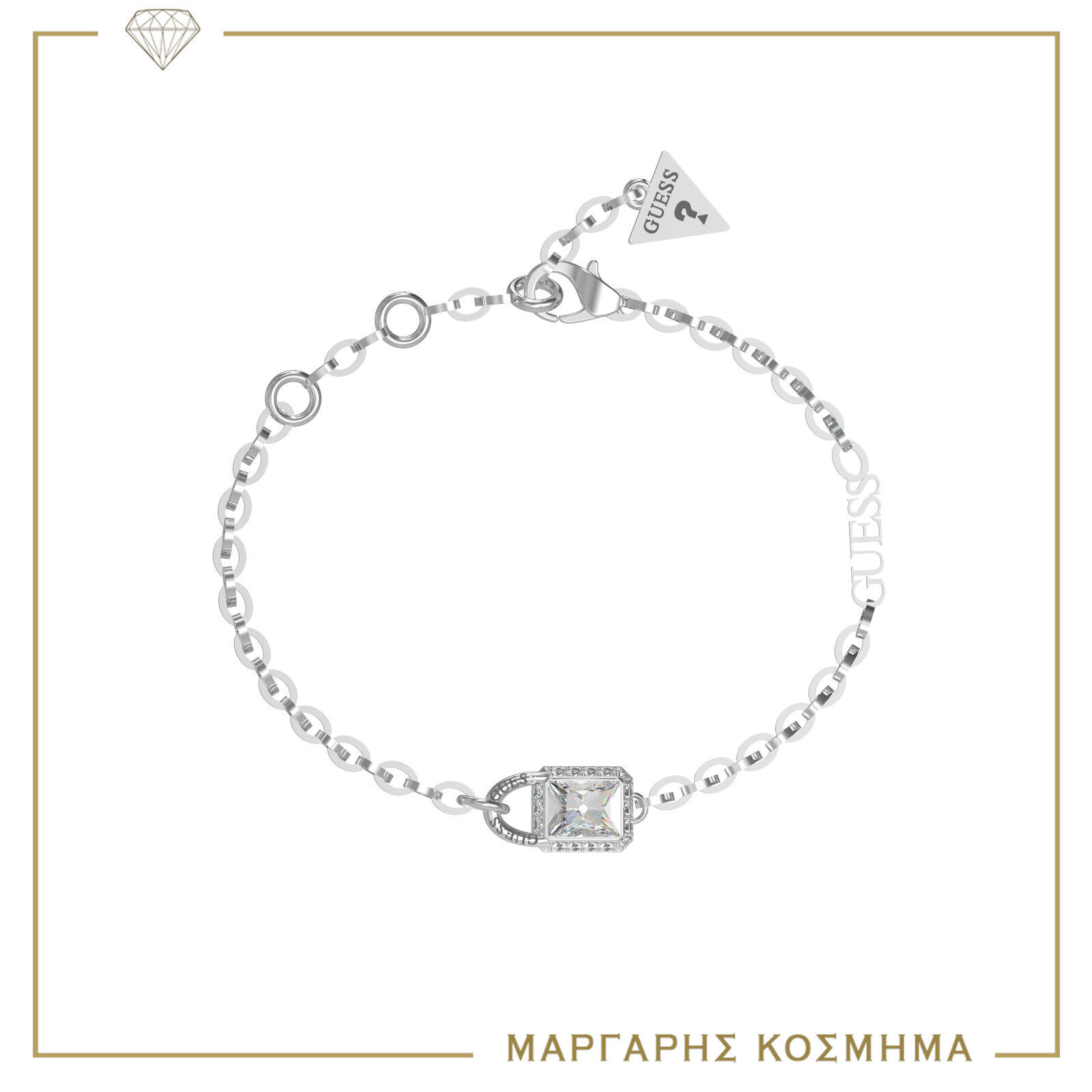 Γυναικείο βραχιόλι Guess Steel σε ασημί χρώμα, με λουστρέ φινίρισμα και τριγωνικό λογότυπο της εταιρείας. 21cm καδένα ρυθμιοζόμενη