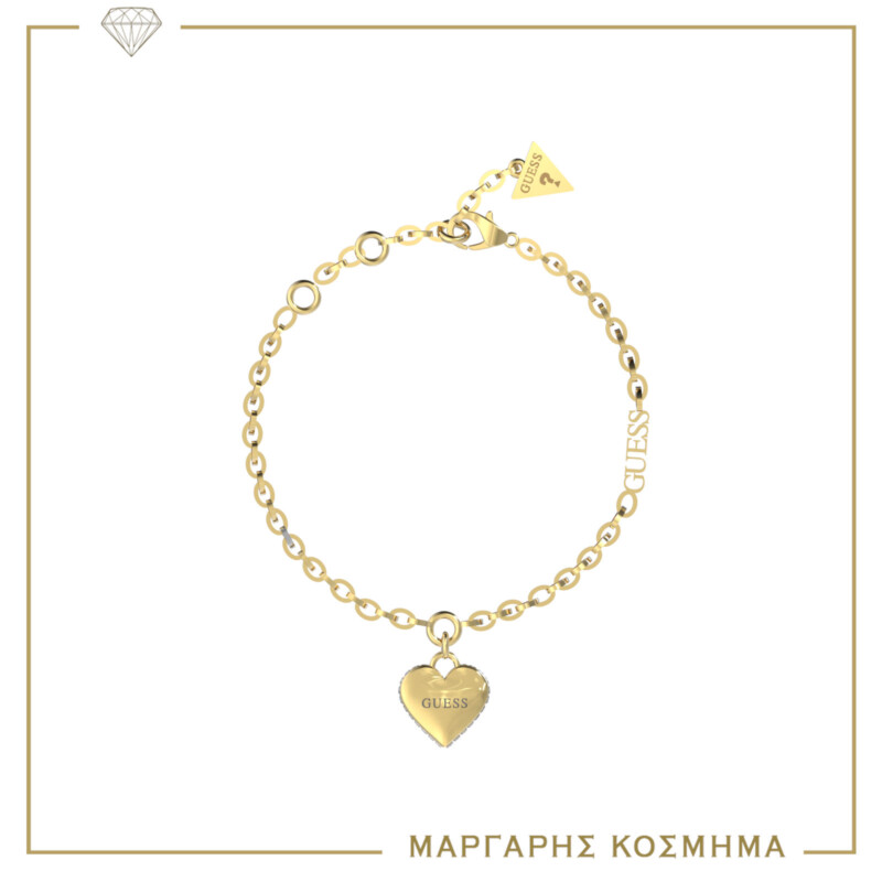 Γυναικείο βραχιόλι GUESS STEEL χρυσού χρώματος με κρεμαστό με σχέδιο. Είναι διακοσμημένο με διαφανείς πέτρες ζιργκόν και έχει το λογότυπο της εταιρείας(18,41cm).