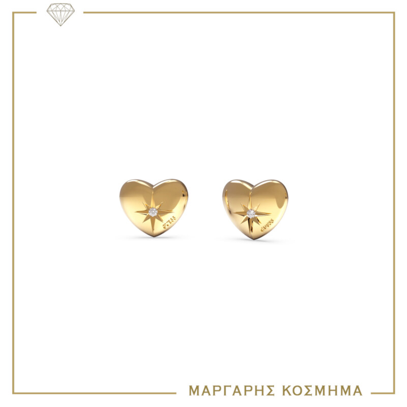 Γυναικεία σκουλαρίκια GUESS STEEL χρυσού χρώματος με σχέδιο καρδιές. Είναι διακοσμημένα με διαφανείς πέτρες ζιργκόν και έχουν το λογότυπο της εταιρείας (1,1cm).