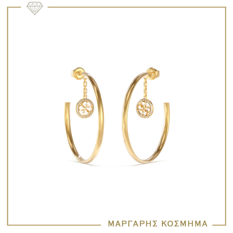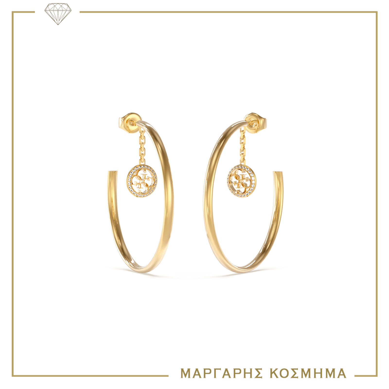 Γυναικεία σκουλαρίκια GUESS STEEL χρυσού χρώματος με σχέδιο κρίκος. Είναι διακοσμημένα με διαφανείς πέτρες ζιργκόν και έχουν το λογότυπο της εταιρείας .