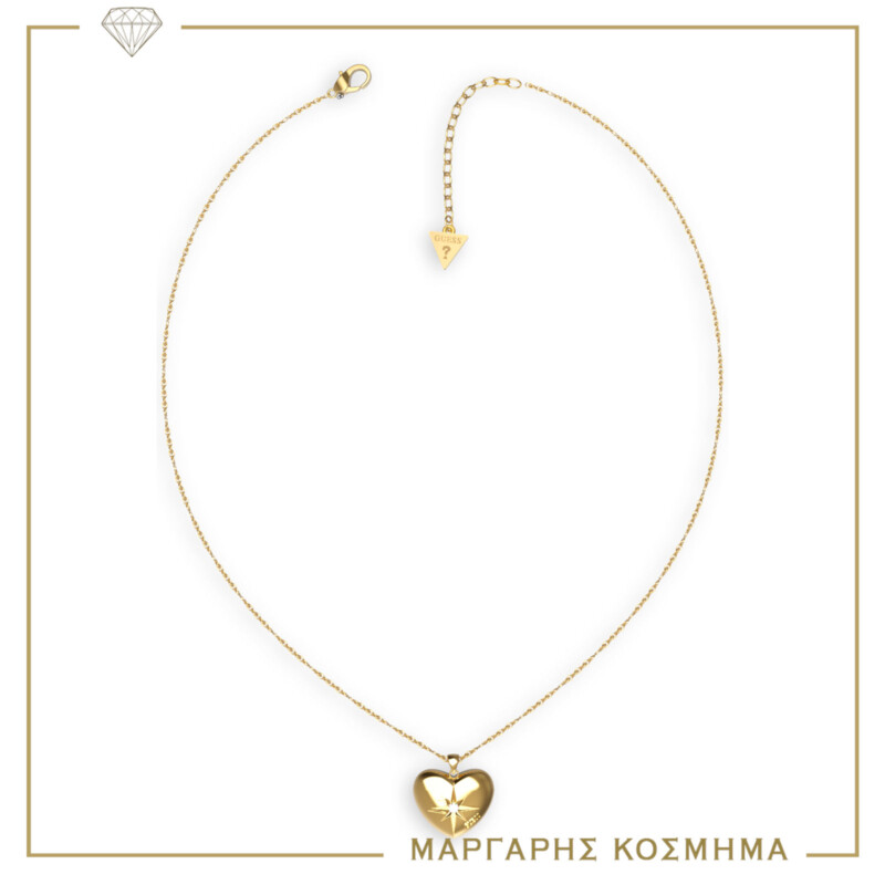 Γυναικείο κολιέ GUESS STEEL χρυσου χρώματος. Είναι διακοσμημένο με διαφανείς πέτρα ζιργκόν καρδία και έχει το λογότυπο της εταιρείας.