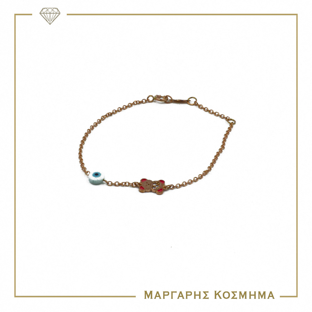 Παιδκό βραχιόλι ροζ χρυσό με αρκουδάκι , πέτρες και ματάκι.