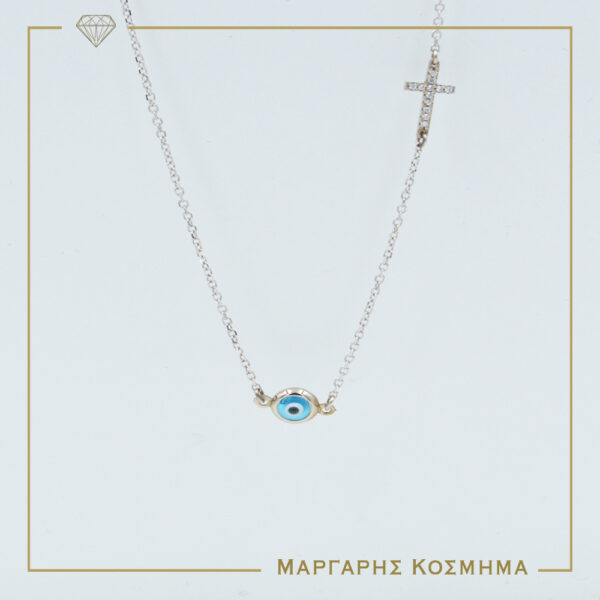 Μοντέρνο λευκόχρυσο κολιέ Κ14, με ματάκι και σταυρουδάκι!