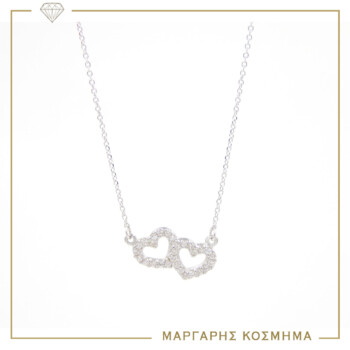Γυναικείο λευκό χρυσό κολιέ διπλές καρδίες με ζιργκόν.