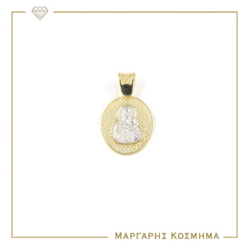 Κρεμαστό φυλαχτό Δίχρωμη Παναγίτσα, από χρυσό, με ανάγλυφες ασημί λεπτομέρειες και ένα μπλε ματάκι