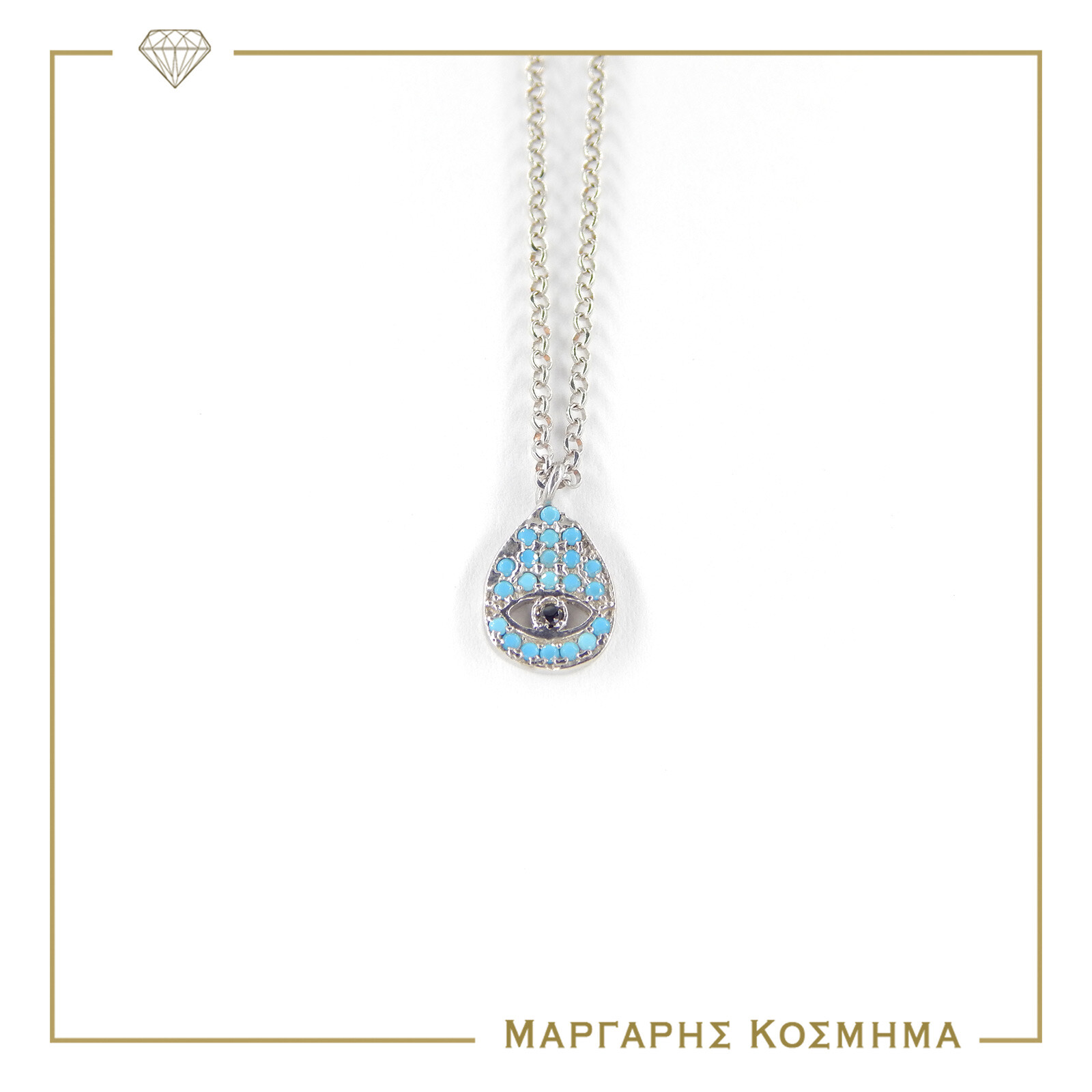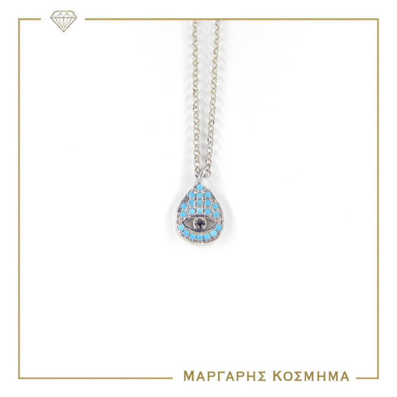 Κολιε ασημενιο σε λευκο χρωμα ματι με μπλε πετρες, εχει κρικακια προεκτασης